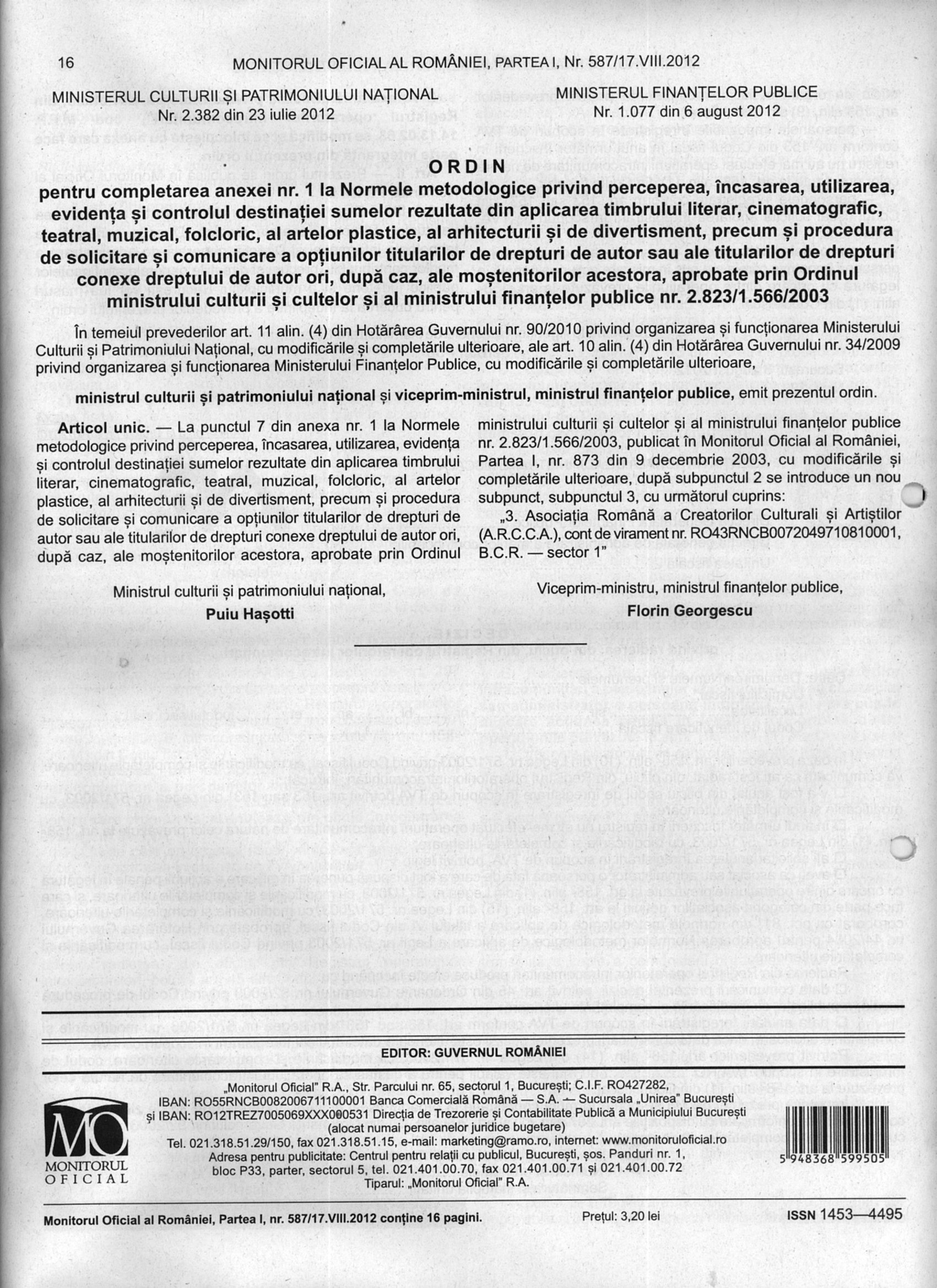 Avem bucuria de a vă anunţa că, prin Ordinul comun al Ministerului Culturii şi Patrimoniului Naţional nr. 2382/23 iulie 2012 şi al Ministerului Finanţelor Publice nr. 1077/6 august 2012, publicat în Monitorul Oficial partea I din nr. 587/17 august 2012, Asociaţia Română a Creatorilor Culturali şi Artiştilor (A.R.C.C.A.) a fost reînscrisă printre Asociaţiile de Creaţie Culturală care sunt abilitate a încasa timbrul literar.